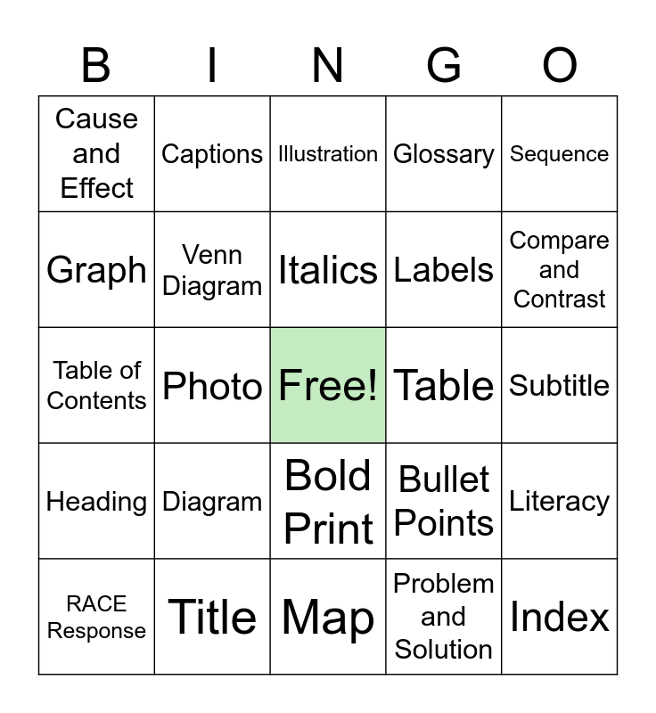 This bingo card has a free space and 24 words: Diagram, Title, Italics, RACE Response, Sequence, Cause and Effect, Graph, Captions, Table, Bold Print, Labels, Table of Contents, Bullet Points, Literacy, Venn Diagram, Problem and Solution, Subtitle, Illustration, Compare and Contrast, Photo, Index, Heading, Glossary and Map.