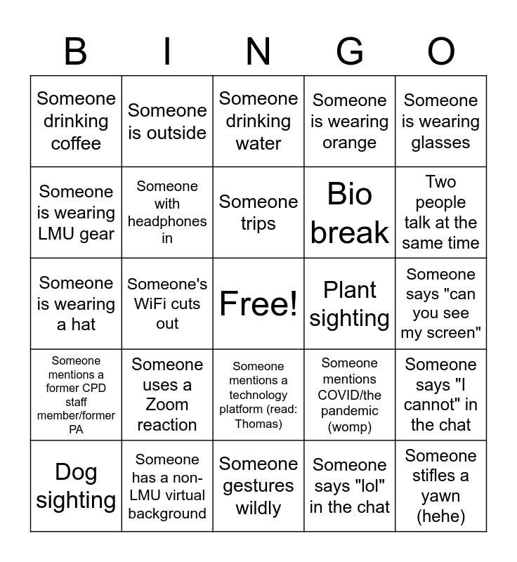 This bingo card has a free space and 29 words: Dog sighting, Someone talks while on mute, Someone's WiFi cuts out, Ella sighting, Someone drinking coffee, Someone drinking water, Someone with headphones in, Someone uses a Zoom reaction, Plant sighting, Someone has a non-LMU virtual background, Someone says "can you see my screen", Someone stifles a yawn (hehe), Someone gestures wildly, Someone says "lol" in the chat, Two people talk at the same time, Someone makes a pop culture reference, Someone mentions a technology platform (read: Thomas), Someone mentions a former CPD staff member/former PA, Someone is wearing glasses, Someone is wearing a hat, Someone mentions COVID/the pandemic (womp), Someone mentions apples, Bio break, Someone is wearing LMU gear, Someone is wearing orange, Someone is outside, Someone says "I cannot" in the chat, Someone trips and Someone uses a Zoom filter.