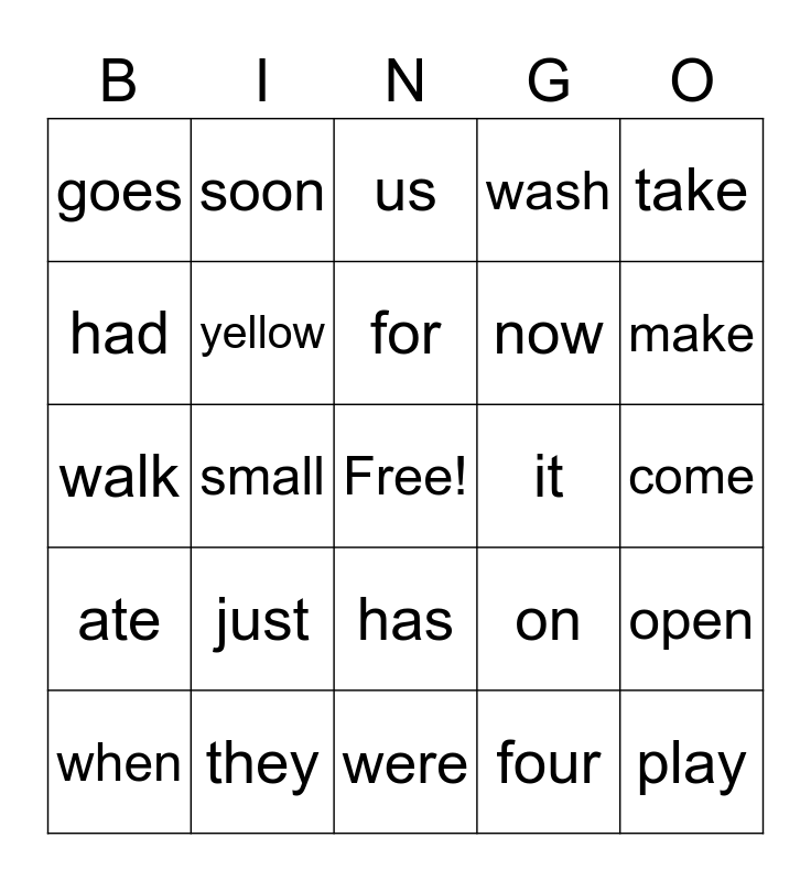 This bingo card has a free space and 24 words: just, they, for, when, take, goes, had, soon, it, has, now, walk, on, open, yellow, four, come, us, make, small, play, ate, wash and were.
