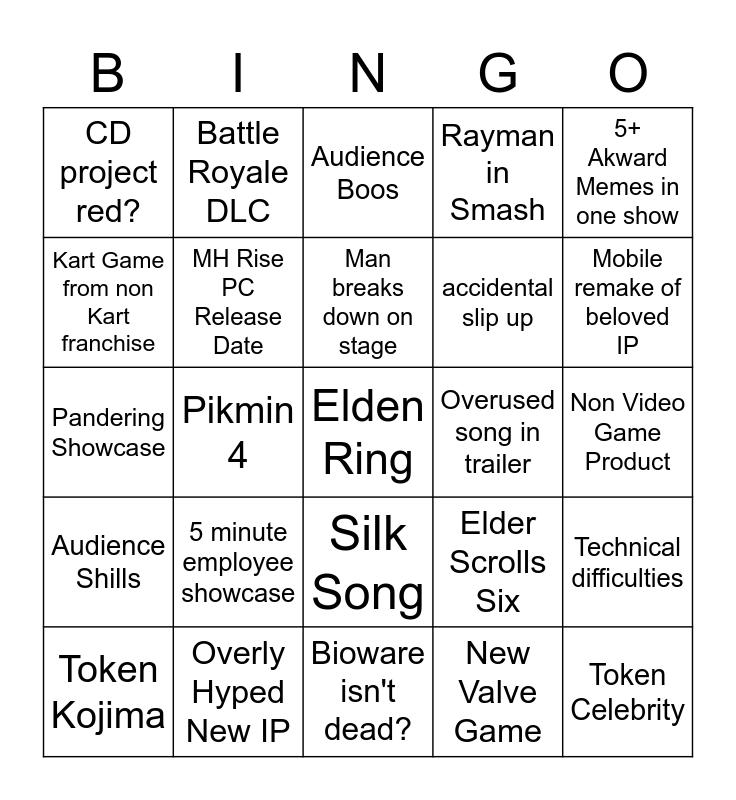 This bingo card has a free space and 24 words: 5 minute employee showcase, Overly Hyped New IP, Man breaks down on stage, Token Kojima, 5+ Akward Memes in one show, CD project red?, Kart Game from non Kart franchise, Battle Royale DLC, Overused song in trailer, Silk Song, accidental slip up, Pandering Showcase, Elder Scrolls Six, Technical difficulties, MH Rise PC Release Date, New Valve Game, Non Video Game Product, Audience Boos, Mobile remake of beloved IP, Pikmin 4, Token Celebrity, Audience Shills, Rayman in Smash and Bioware isn't dead?.