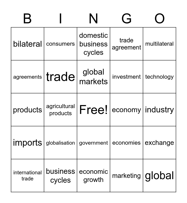 This bingo card has a free space and 24 words: globalisation, business cycles, global markets, international trade, multilateral, bilateral, agreements, consumers, economy, government, investment, products, economies, exchange, trade, marketing, industry, domestic business cycles, technology, agricultural products, global, imports, trade agreement and economic growth.