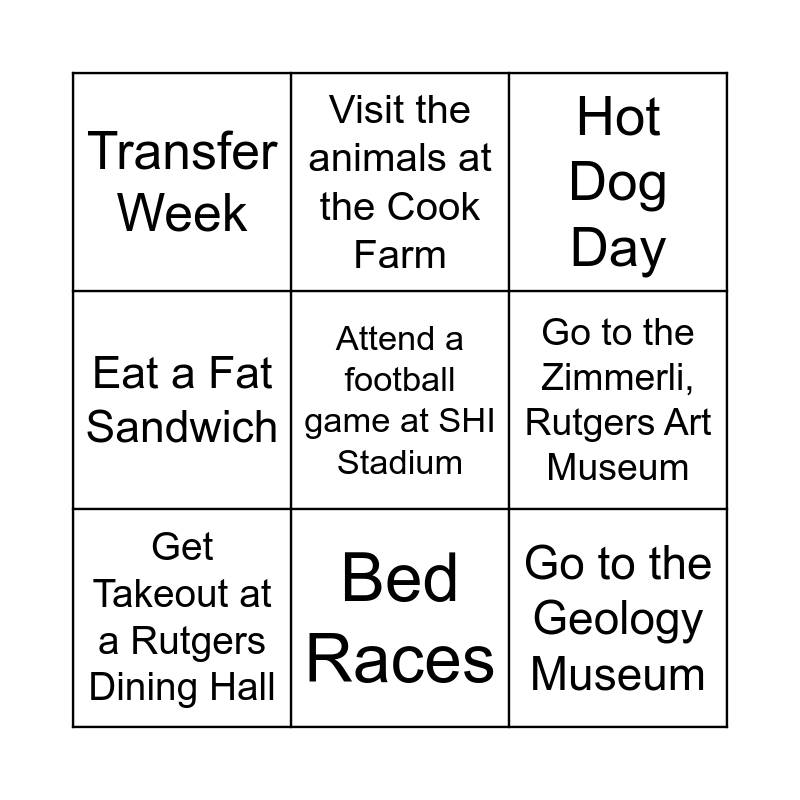 This bingo card has 15 words: Involvement Fair, Rutgers Day, Hot Dog Day, Transfer Week, Bed Races, Attend a football game at SHI Stadium, Attend a basketball game at the RAC, Go to a show produced by Mason Gross or our three student theatre companies, Go to the Zimmerli, Rutgers Art Museum, Go to the Geology Museum, Go to the Food Trucks on Campus, Eat a Fat Sandwich, Get Takeout at a Rutgers Dining Hall, Visit the animals at the Cook Farm and Running in the Big Chill.