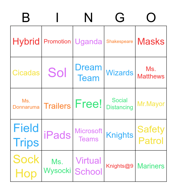 This bingo card has a free space and 24 words: iPads, Ms. Wysocki, Dream Team, Sock Hop, Masks, Hybrid, Cicadas, Promotion, Social Distancing, Microsoft Teams, Wizards, Ms. Donnaruma, Knights, Safety Patrol, Sol, Knights@9, Mr.Mayor, Uganda, Ms. Matthews, Trailers, Mariners, Field Trips, Shakespeare and Virtual School.