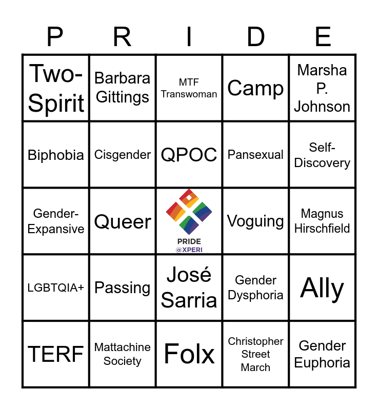 This bingo card has a free space and 54 words: Enby, Passing, bell hooks, Sapphic, Magnus Hirschfield, Sylvia Rivera, Cisgender, Intersectionality, Camp, Karl Ulrichs, Two-Spirit, Kiki, Christopher Street March, Ally, Edith Windsor, Bayard Rustin, QPOC, Pansexual, Pronouns, TERF, Mattachine Society, Folx, Voguing, Marsha P. Johnson, Coming Out, Barbara Gittings, José Sarria, Gilbert Baker, Latinx, Butch, Lipstick Lesbian, Stud, Gay, Asexual, Biphobia, FTM Transman, MTF Transwoman, Gender Dysphoria, Gender Euphoria, Gender-Expansive, Heteronormative, Cisnormative, Corporate Pride, Omnisexual, Clocking, Drag, Gender Affirming Hormones, Transition, Self-Discovery, LGBTQIA+, Queer, Nibling, GNC and Spouse/Partner.