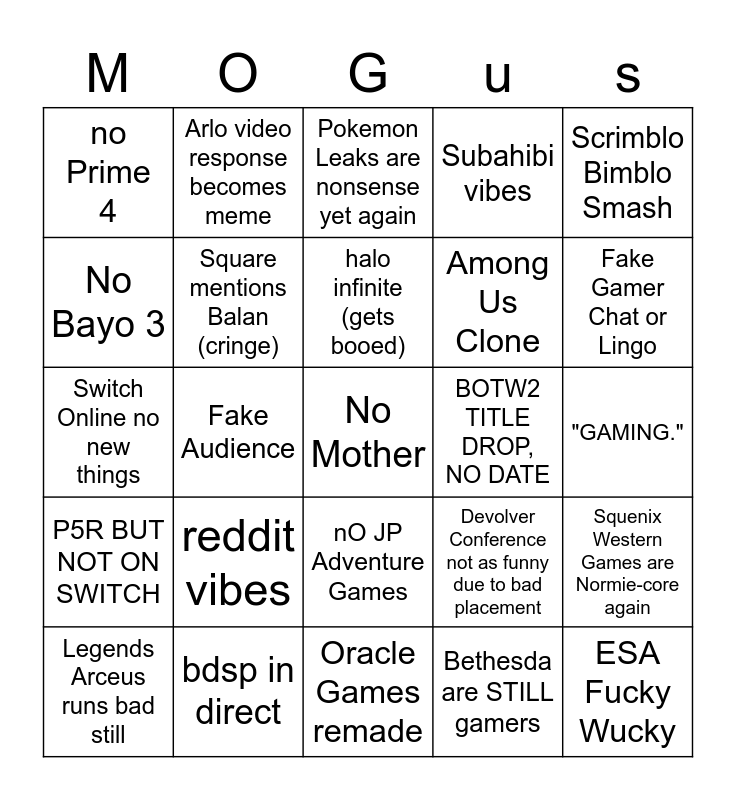 This bingo card has a free space and 24 words: reddit vibes, bdsp in direct, halo infinite (gets booed), Legends Arceus runs bad still, Scrimblo Bimblo Smash, no Prime 4, No Bayo 3, Arlo video response becomes meme, BOTW2 TITLE DROP, NO DATE, nO JP Adventure Games, Among Us Clone, Switch Online no new things, Devolver Conference not as funny due to bad placement, Squenix Western Games are Normie-core again, Square mentions Balan (cringe), Bethesda are STILL gamers, "GAMING.", Pokemon Leaks are nonsense yet again, Fake Gamer Chat or Lingo, Fake Audience, ESA Fucky Wucky, P5R BUT NOT ON SWITCH, Subahibi vibes and Oracle Games remade.