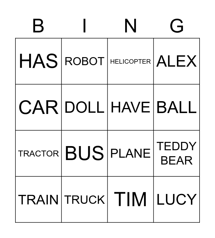 This bingo card has 16 words: TRUCK, TEDDY BEAR, HELICOPTER, HAS, TRACTOR, ROBOT, PLANE, TIM, CAR, DOLL, TRAIN, ALEX, BUS, BALL, HAVE and LUCY.