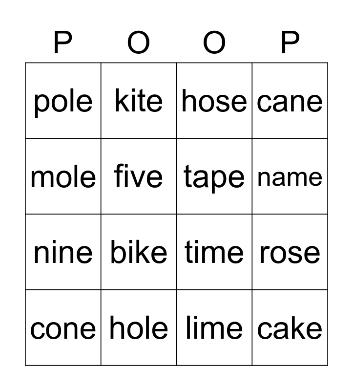 This bingo card has 20 words: rose, nose, hose, bone, cone, mole, hole, pole, nine, kite, bike, time, five, cake, tape, cave, name, cane, lime and tire.