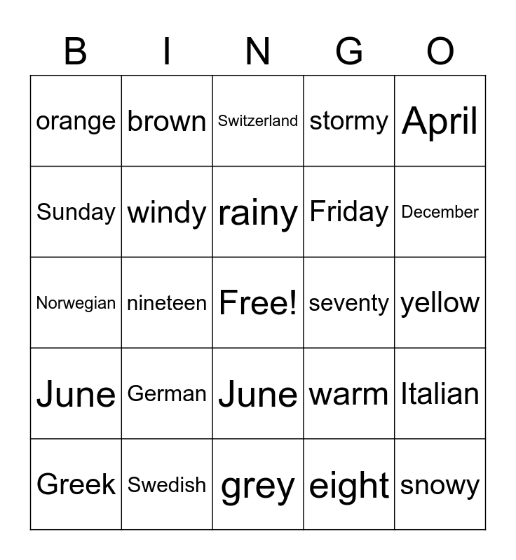 This bingo card has a free space and 24 words: German, Swedish, rainy, Greek, April, orange, Sunday, brown, seventy, June, Friday, Norwegian, warm, Italian, windy, eight, yellow, Switzerland, December, nineteen, snowy, June, stormy and grey.