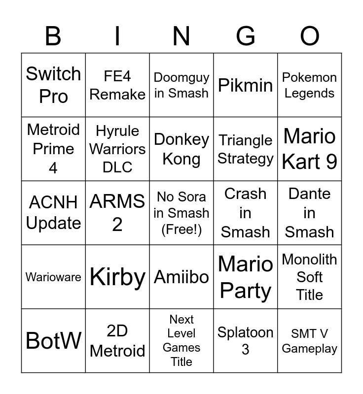 This bingo card has a free space and 24 words: BotW, Kirby, Donkey Kong, Splatoon 3, Pokemon Legends, Switch Pro, FE4 Remake, Doomguy in Smash, Crash in Smash, Dante in Smash, ACNH Update, Hyrule Warriors DLC, Mario Party, Monolith Soft Title, Metroid Prime 4, 2D Metroid, Next Level Games Title, Pikmin, Mario Kart 9, Warioware, ARMS 2, Amiibo, Triangle Strategy and SMT V Gameplay.