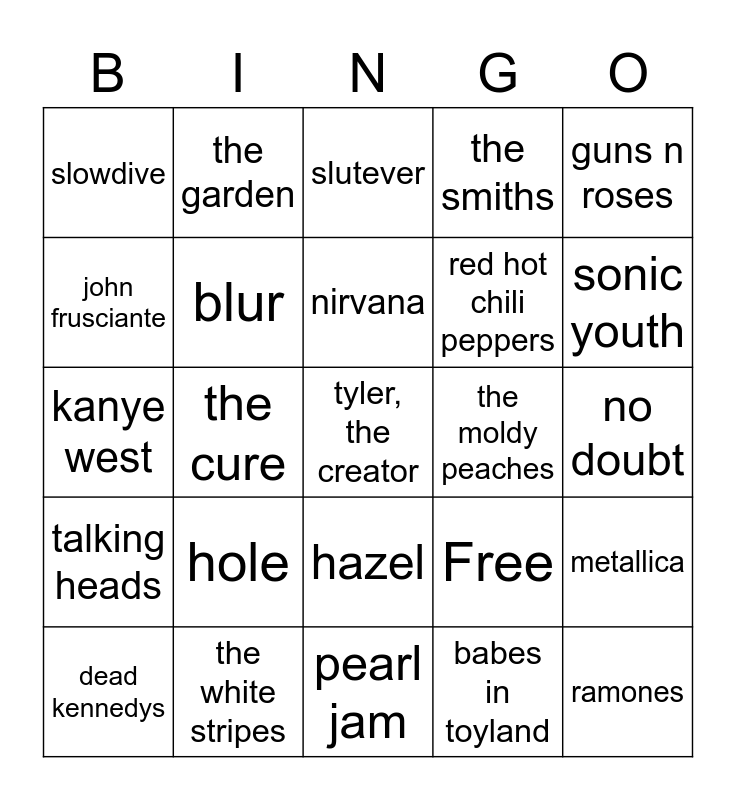 This bingo card has 25 words: hole, pearl jam, nirvana, dead kennedys, guns n roses, slowdive, john frusciante, the garden, the moldy peaches, hazel, red hot chili peppers, kanye west, Free, metallica, blur, ramones, no doubt, slutever, sonic youth, the cure, tyler, the creator, the white stripes, talking heads, the smiths and babes in toyland.