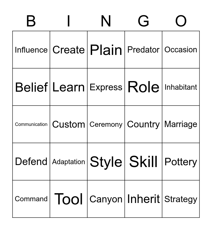 This bingo card has a free space and 65 words: Craft, Musical, Perform, Pottery, Tradition, Weave, Create, Culture, Express, Medium, Style, Ancestor, Marriage, Occasion, Ritual, Belief, Custom, Influence, Relationship, Role, Adaptation, Defend, Predator, Prey, Trait, Behavior, Characteristic, Response, Strategy, Survival, Command, Imitate, Memory, Pattern, Skill, Tool, Ability, Communication, Inherit, Language, Learn, Continent, Country, Equator, Globe, Hemisphere, Inhabitant, Map, Border, Imagine, Range, Suggest, Transport, Canyon, Elevation, Landform, Ocean, Plain, Plateau, Valley, Feature, Locate, Physical, Region and Surface.