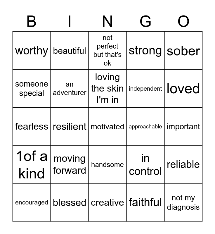 This bingo card has 30 words: blessed, hardworking, resilient, sober, worthy, not perfect but that's ok, an adventurer, handsome, approachable, creative, important, motivated, faithful, not my diagnosis, loved, educated, in control, 1of a kind, moving forward, sober, fearless, alive, beautiful, independent, someone special, strong, reliable, encouraged, loving the skin I'm in and a survivor.