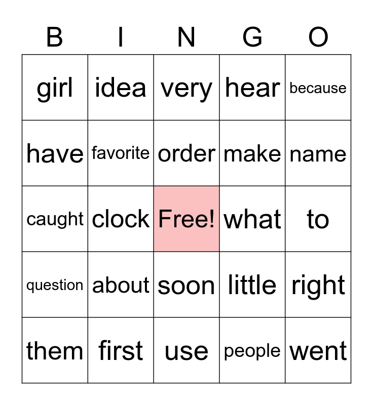 This bingo card has a free space and 24 words: about, first, order, them, because, girl, have, idea, what, soon, make, caught, little, right, favorite, people, to, very, name, clock, went, question, hear and use.