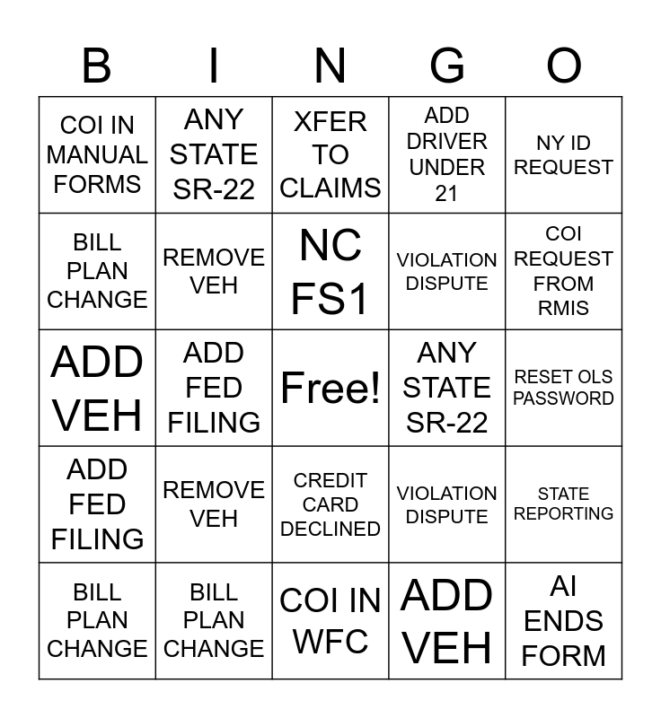 This bingo card has a free space and 58 words: DUE DATE CHANGE, BILL PLAN CHANGE, ADD STATE FILING, ADD FED FILING, ADD VEH, ADD DRIVER, REMOVE VEH, REMOVE DRIVER, VIOLATION DISPUTE, ADD DRIVER W/ FDL, ADD DRIVER UNDER 21, ADD DRIVER OVER 81, CALL OUT FOR APPROVED STATED AMT, CREDIT CARD DECLINED, COI IN WFC, COI IN MANUAL FORMS, AI ENDS FORM, NY ID REQUEST, NJ ID REQUEST, NC FS1, ANY STATE SR-22, XFER TO CLAIMS, BILL PLAN CHANGE, STATE REPORTING, CALL SRT, RESET OLS PASSWORD, EMAIL DOC TO CUSTOMER, EMAIL DOC TO AGENT, COI REQUEST FROM RMIS, CALL OUT TO CUSTOMER, ESCALATION, CALL OUT TO AGENT, SPECIAL VERBIAGE ON COI, TRANSFER CALL TO FLEET, DUE DATE CHANGE, BILL PLAN CHANGE, ADD STATE FILING, ADD FED FILING, ADD VEH, ADD DRIVER, REMOVE VEH, REMOVE DRIVER, VIOLATION DISPUTE, ADD DRIVER W/ FDL, ADD DRIVER UNDER 21, ADD DRIVER OVER 81, CALL OUT FOR APPROVED STATED AMT, CREDIT CARD DECLINED, COI IN WFC, COI IN MANUAL FORMS, AI ENDS FORM, NY ID REQUEST, NJ ID REQUEST, NC FS1, ANY STATE SR-22, XFER TO CLAIMS, BILL PLAN CHANGE and STATE REPORTING.