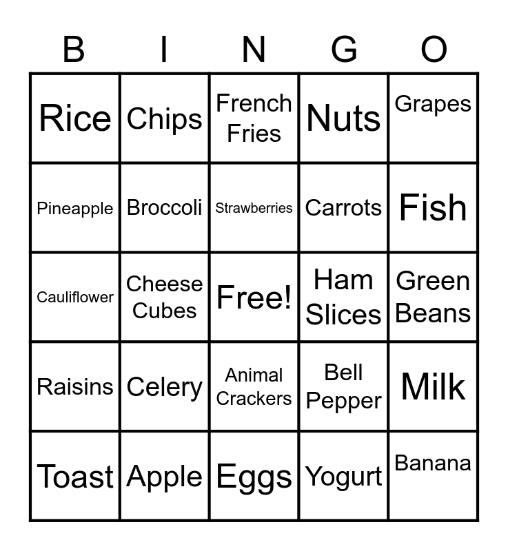This bingo card has a free space and 29 words: Bread, Apple, French Fries, Bread, Grapes, Rice, Broccoli, Strawberries, Ham Slices, Milk, Toast, Cheese Cubes, Yogurt, Banana, Cauliflower, Brownie, Eggs, Bell Pepper, Fish, Raisins, Celery, Chicken, Carrots, Green Beans, Pineapple, Chips, Animal Crackers, Nuts and Peanut Butter.