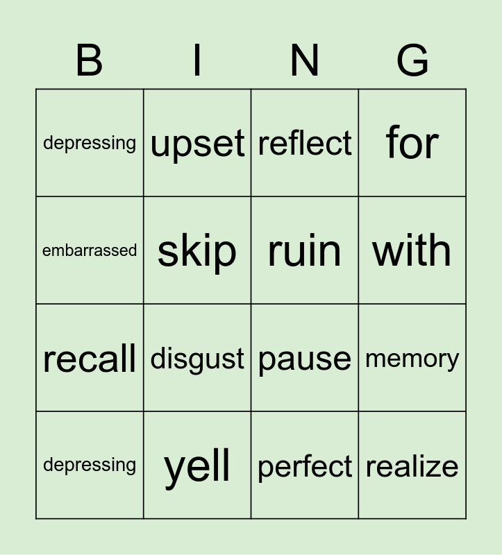 This bingo card has 19 words: pause, remind, reflect, realize, memory, embarrassed, perfect, depressing, upset, recall, disgust, skip, ruin, yell, depressing, fortunately, for, with and went.