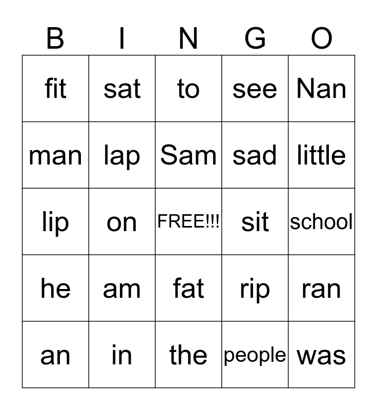 This bingo card has a free space and 24 words: am, in, Sam, an, Nan, fit, man, sat, sit, fat, sad, lip, rip, ran, lap, people, school, to, little, on, was, he, see and the.