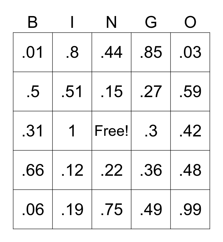This bingo card has a free space and 24 words: .12, .19, .15, .06, .03, .01, .5, .8, .3, .22, .27, .31, .36, .48, .51, .49, .42, .44, .59, 1, .99, .66, .85 and .75.