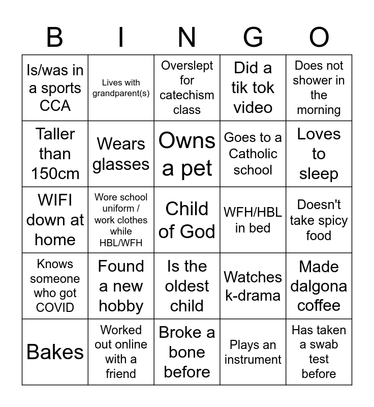 This bingo card has a free space and 24 words: Found a new hobby, Worked out online with a friend, Owns a pet, Bakes, Does not shower in the morning, Is/was in a sports CCA, Taller than 150cm, Lives with grandparent(s), WFH/HBL in bed, Is the oldest child, Goes to a Catholic school, WIFI down at home, Watches k-drama, Made dalgona coffee, Wears glasses, Plays an instrument, Doesn't take spicy food, Overslept for catechism class, Loves to sleep, Wore school uniform / work clothes while HBL/WFH, Has taken a swab test before, Knows someone who got COVID, Did a tik tok video and Broke a bone before.