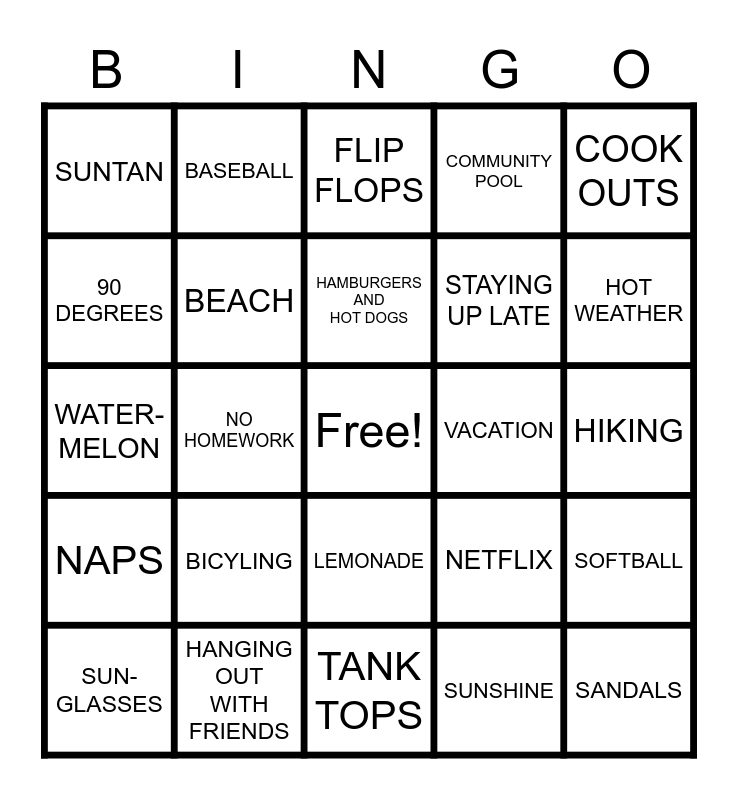 This bingo card has a free space and 29 words: SUN-GLASSES, SWIMMING, NO HOMEWORK, SLEEPING IN, SUNTAN, FLIP FLOPS, BEACH, BICYLING, VACATION, HANGING OUT WITH FRIENDS, HIKING, SANDALS, TANK TOPS, SUNSHINE, HOT WEATHER, SKATING, LEMONADE, NAPS, COOK OUTS, WATER-MELON, NETFLIX, FLOWERS, STAYING UP LATE, 90 DEGREES, COMMUNITY POOL, BASEBALL, SOFTBALL, HAMBURGERS AND HOT DOGS and READING.