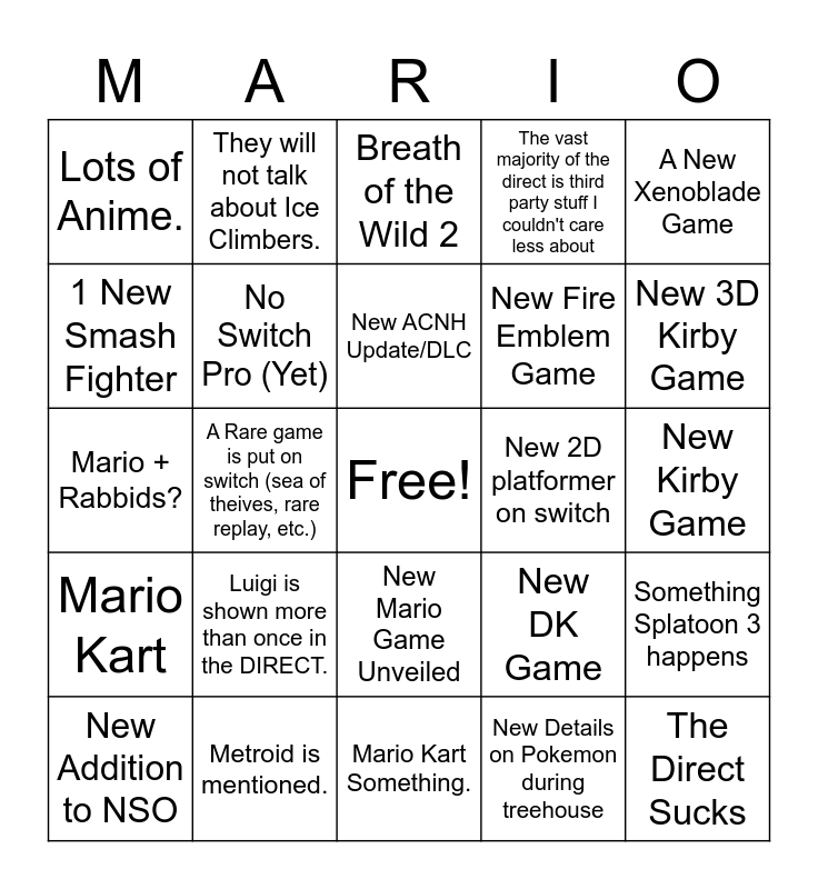 This bingo card has a free space and 24 words: Luigi is shown more than once in the DIRECT., Metroid is mentioned., New ACNH Update/DLC, New Addition to NSO, A New Xenoblade Game, Lots of Anime., 1 New Smash Fighter, They will not talk about Ice Climbers., New 2D platformer on switch, New Mario Game Unveiled, New Fire Emblem Game, Mario + Rabbids?, New DK Game, Something Splatoon 3 happens, No Switch Pro (Yet), New Details on Pokemon during treehouse, New Kirby Game, Breath of the Wild 2, New 3D Kirby Game, A Rare game is put on switch (sea of theives, rare replay, etc.), The Direct Sucks, Mario Kart, The vast majority of the direct is third party stuff I couldn't care less about and Mario Kart Something..