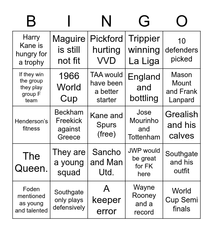 This bingo card has a free space and 24 words: They are a young squad, Southgate only plays defensively, TAA would have been a better starter, Foden mentioned as young and talented, 10 defenders picked, Harry Kane is hungry for a trophy, If they win the group they play group F team, Maguire is still not fit, Jose Mourinho and Tottenham, Sancho and Man Utd., England and bottling, Henderson’s fitness, JWP would be great for FK here, Southgate and his outfit, 1966 World Cup, Wayne Rooney and a record, Grealish and his calves, Pickford hurting VVD, Mason Mount and Frank Lanpard, Beckham Freekick against Greece, World Cup Semi finals, The Queen., Trippier winning La Liga and A keeper error.