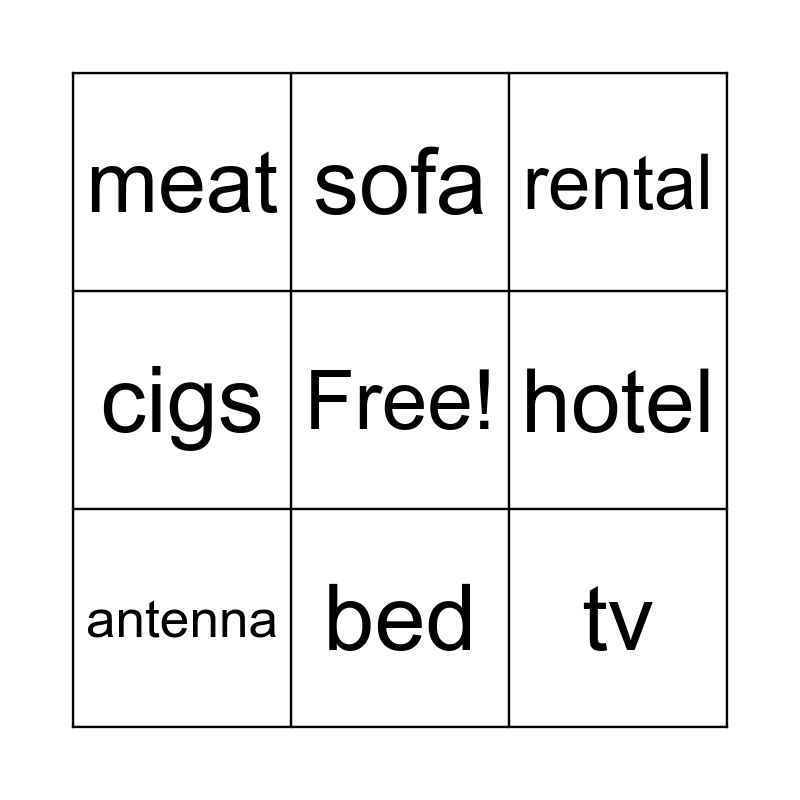 This bingo card has a free space and 8 words: hotel, rental, sofa, antenna, meat, tv, cigs and bed.