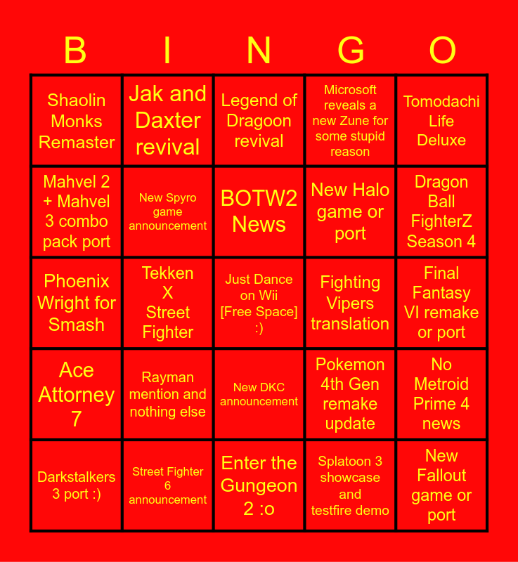 This bingo card has a free space and 24 words: Rayman mention and nothing else, Street Fighter 6 announcement, BOTW2 News, Darkstalkers 3 port :), Tomodachi Life Deluxe, Shaolin Monks Remaster, Mahvel 2 + Mahvel 3 combo pack port, Jak and Daxter revival, Fighting Vipers translation, New DKC announcement, New Halo game or port, Phoenix Wright for Smash, Pokemon 4th Gen remake update, No Metroid Prime 4 news, New Spyro game announcement, Splatoon 3 showcase and testfire demo, Final Fantasy VI remake or port, Legend of Dragoon revival, Dragon Ball FighterZ Season 4, Tekken X Street Fighter, New Fallout game or port, Ace Attorney 7, Microsoft reveals a new Zune for some stupid reason and Enter the Gungeon 2 :o.