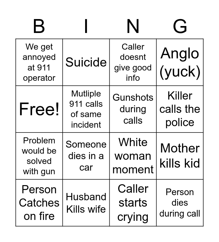 This bingo card has 16 words: Husband Kills wife, Mother kills kid, Caller doesnt give good info, We get annoyed at 911 operator, Problem would be solved with gun, Suicide, White woman moment, Caller starts crying, Free!, Mutliple 911 calls of same incident, Person Catches on fire, Anglo (yuck), Someone dies in a car, Killer calls the police, Gunshots during calls and Person dies during call.