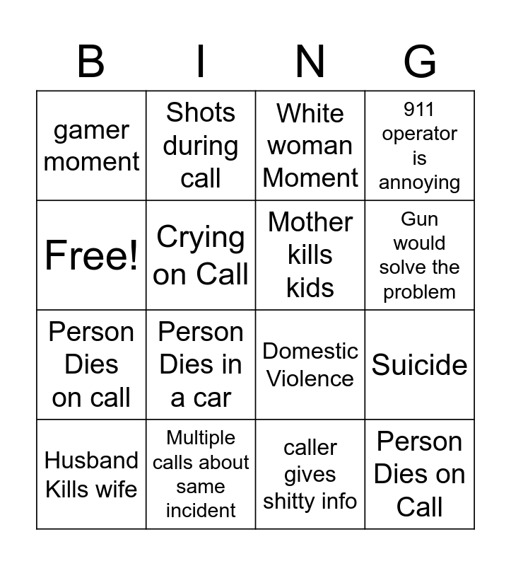 This bingo card has 16 words: Multiple calls about same incident, Suicide, White woman Moment, gamer moment, Person Dies on call, Shots during call, Domestic Violence, caller gives shitty info, Free!, Crying on Call, Husband Kills wife, 911 operator is annoying, Person Dies in a car, Gun would solve the problem, Mother kills kids and Person Dies on Call.