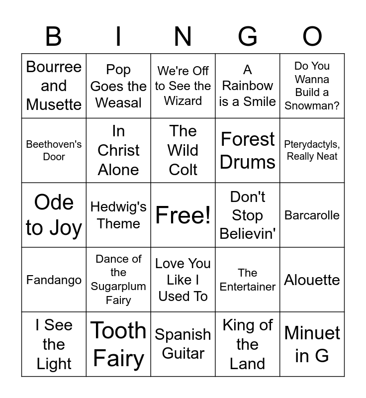 This bingo card has a free space and 33 words: Beatles Medley, In the Mood, Hedwig's Theme, Watermelon Sugar, Fandango, In Christ Alone, Do You Wanna Build a Snowman?, I See the Light, Pop Goes the Weasal, The Clock Shop, The Wild Colt, We're Off to See the Wizard, The Throne Room, La Fille Au Cheveux De Lin, Don't Stop Believin', Pterydactyls, Really Neat, Tooth Fairy, Ode to Joy, Dance of the Sugarplum Fairy, The Entertainer, Love You Like I Used To, Shallow, Bourree and Musette, Barcarolle, Spanish Guitar, Minuet in G, A Rainbow is a Smile, Forest Drums, Beethoven's Door, Alouette, Twinkle, Twinkle, Little Star, King of the Land and Captain Akash.