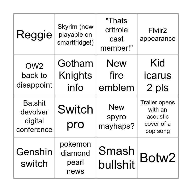 This bingo card has 16 words: pokemon diamond pearl news, Trailer opens with an acoustic cover of a pop song, "Thats critrole cast member!", Reggie, Batshit devolver digital conference, Skyrim (now playable on smartfridge!), New spyro mayhaps?, Smash bullshit, OW2 back to disappoint, Gotham Knights info, Genshin switch, Ffviir2 appearance, Switch pro, Kid icarus 2 pls, New fire emblem and Botw2.
