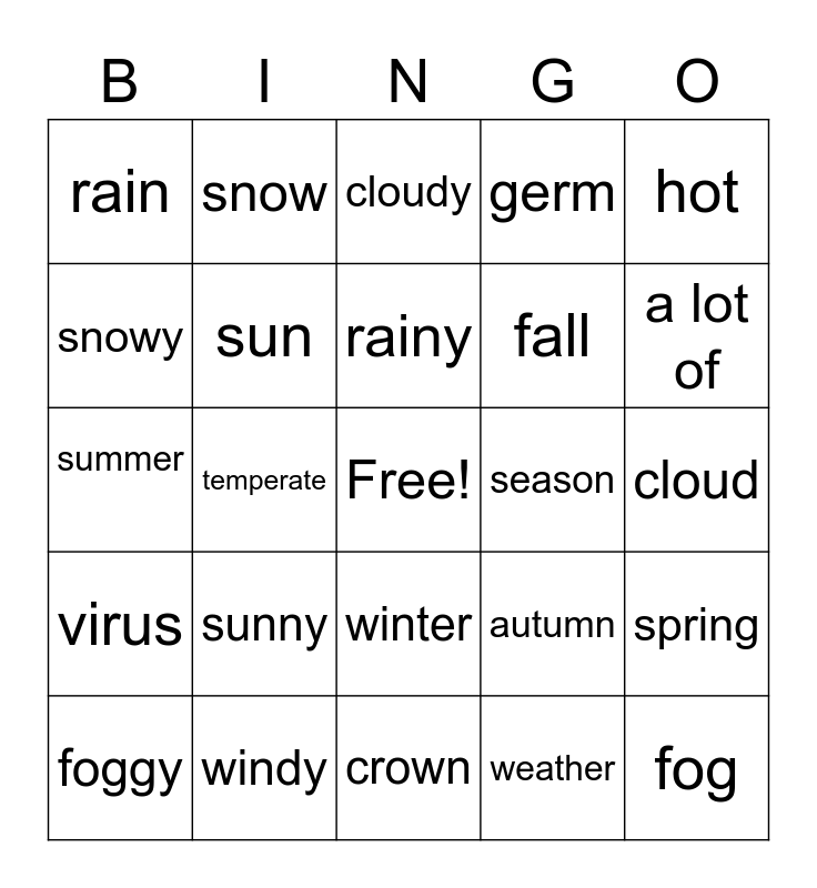 This bingo card has a free space and 24 words: sunny, windy, rainy, foggy, hot, rain, snowy, snow, season, winter, fall, summer, autumn, spring, sun, weather, cloud, cloudy, a lot of, temperate, fog, virus, germ and crown.