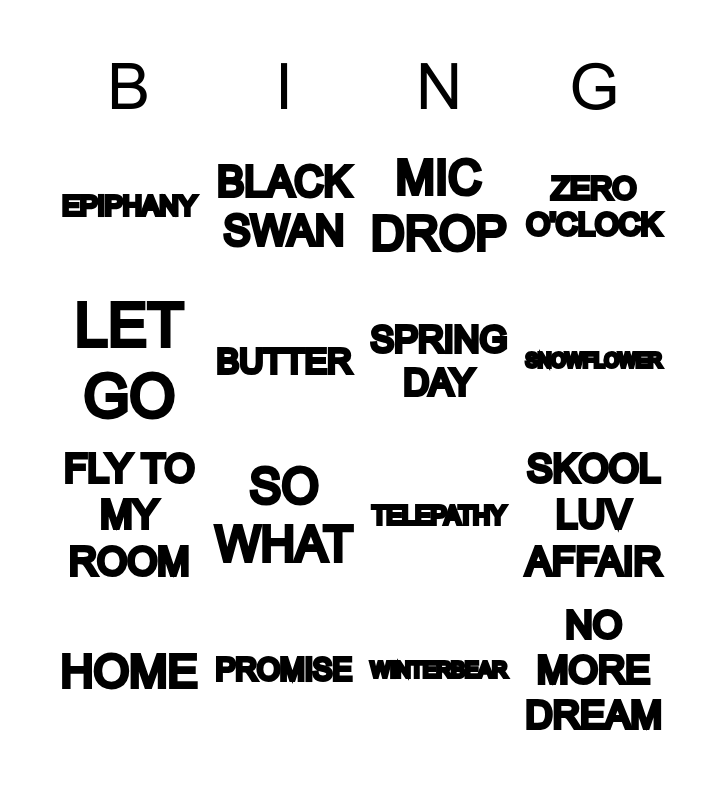 This bingo card has 16 words: PROMISE, SKOOL LUV AFFAIR, MIC DROP, EPIPHANY, FLY TO MY ROOM, BLACK SWAN, TELEPATHY, WINTERBEAR, LET GO, BUTTER, HOME, ZERO O'CLOCK, SO WHAT, SNOWFLOWER, SPRING DAY and NO MORE DREAM.