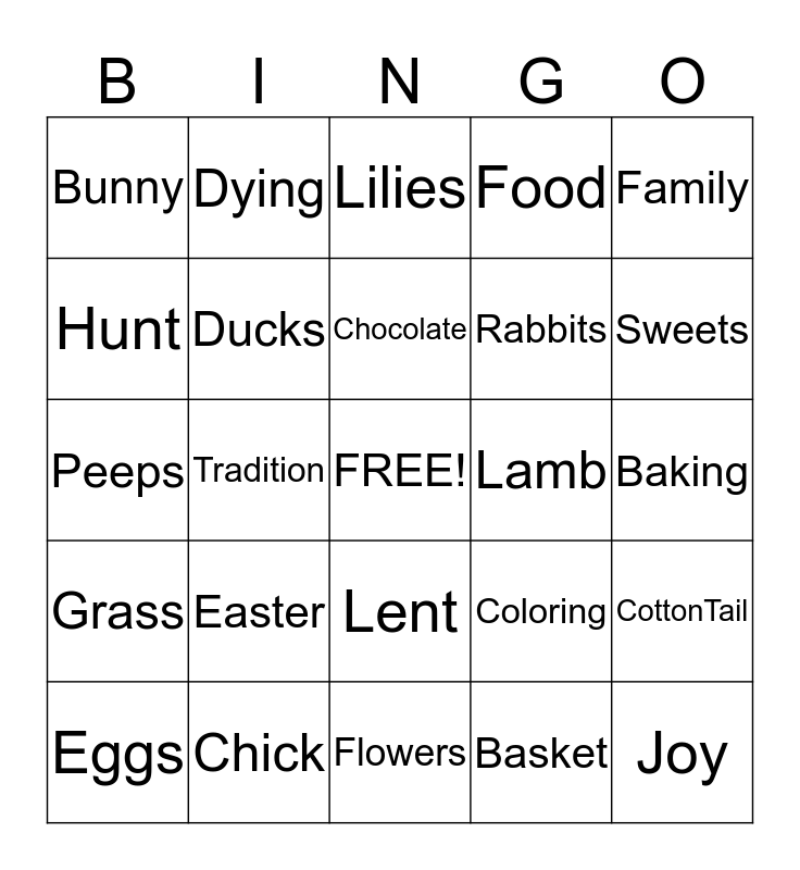 This bingo card has a free space and 24 words: Easter, Chick, Chocolate, Eggs, Family, Bunny, Hunt, Dying, Lamb, Lent, Rabbits, Peeps, Coloring, CottonTail, Ducks, Basket, Baking, Lilies, Sweets, Tradition, Joy, Grass, Food and Flowers.