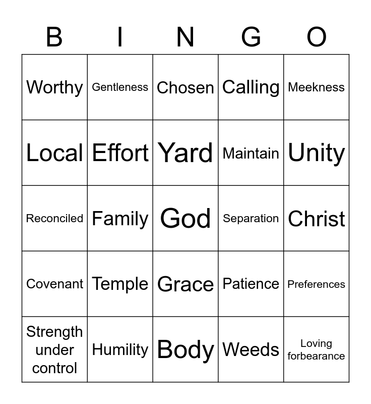 This bingo card has a free space and 32 words: Weeds, Relationship, Family, Walk, Covenant, Effort, Meekness, Preferences, Gentleness, Temple, Yard, Chosen, Head, Wisdom, Separation, Church, Strength under control, Reconciled, Grace, Temple, Patience, Therefore, Christ, Humility, Loving forbearance, Calling, Maintain, Local, Worthy, Body, Love and Unity.