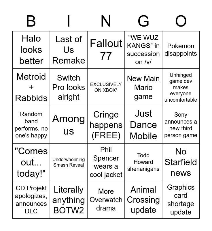 This bingo card has a free space and 24 words: Underwhelming Smash Reveal, Literally anything BOTW2, EXCLUSIVELY ON XBOX*, CD Projekt apologizes, announces DLC, Pokemon disappoints, Halo looks better, Metroid + Rabbids, Last of Us Remake, Just Dance Mobile, Phil Spencer wears a cool jacket, New Main Mario game, Random band performs, no one's happy, Todd Howard shenanigans, No Starfield news, Switch Pro looks alright, Animal Crossing update, Sony announces a new third person game, Fallout 77, Unhinged game dev makes everyone uncomfortable, Among us, Graphics card shortage update, "Comes out... today!", "WE WUZ KANGS" in succession on /v/ and More Overwatch drama.