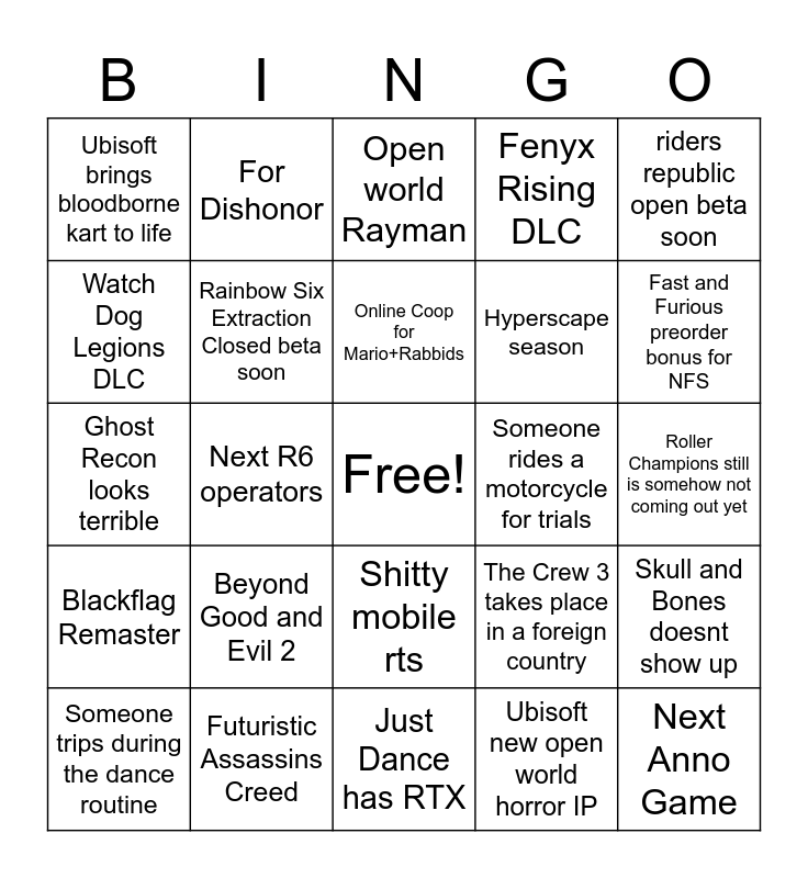 This bingo card has a free space and 24 words: Beyond Good and Evil 2, Futuristic Assassins Creed, Online Coop for Mario+Rabbids, Someone trips during the dance routine, riders republic open beta soon, Ubisoft brings bloodborne kart to life, Watch Dog Legions DLC, For Dishonor, Someone rides a motorcycle for trials, Shitty mobile rts, Hyperscape season, Ghost Recon looks terrible, The Crew 3 takes place in a foreign country, Skull and Bones doesnt show up, Rainbow Six Extraction Closed beta soon, Ubisoft new open world horror IP, Roller Champions still is somehow not coming out yet, Open world Rayman, Fast and Furious preorder bonus for NFS, Next R6 operators, Next Anno Game, Blackflag Remaster, Fenyx Rising DLC and Just Dance has RTX.