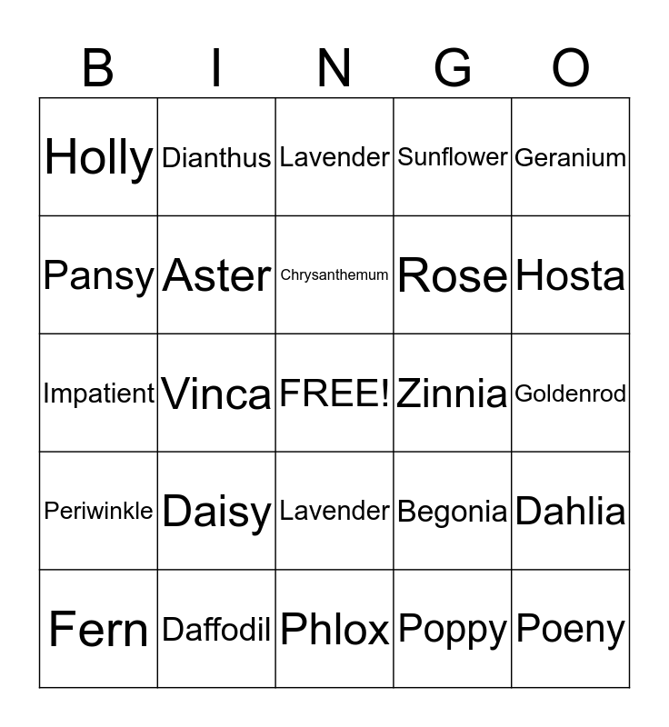 This bingo card has a free space and 24 words: Daisy, Daffodil, Chrysanthemum, Fern, Geranium, Holly, Pansy, Dianthus, Zinnia, Lavender, Rose, Impatient, Begonia, Dahlia, Aster, Poppy, Goldenrod, Lavender, Hosta, Vinca, Poeny, Periwinkle, Sunflower and Phlox.