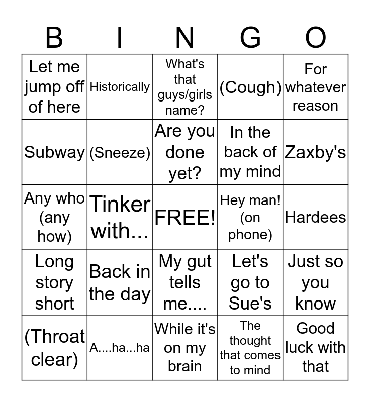 This bingo card has a free space and 24 words: Back in the day, A....ha...ha, Are you done yet?, (Throat clear), For whatever reason, Let me jump off of here, Subway, Historically, Hey man! (on phone), My gut tells me...., In the back of my mind, Any who (any how), Let's go to Sue's, Just so you know, (Sneeze), The thought that comes to mind, Hardees, What's that guys/girls name?, Zaxby's, Tinker with..., Good luck with that, Long story short, (Cough) and While it's on my brain.