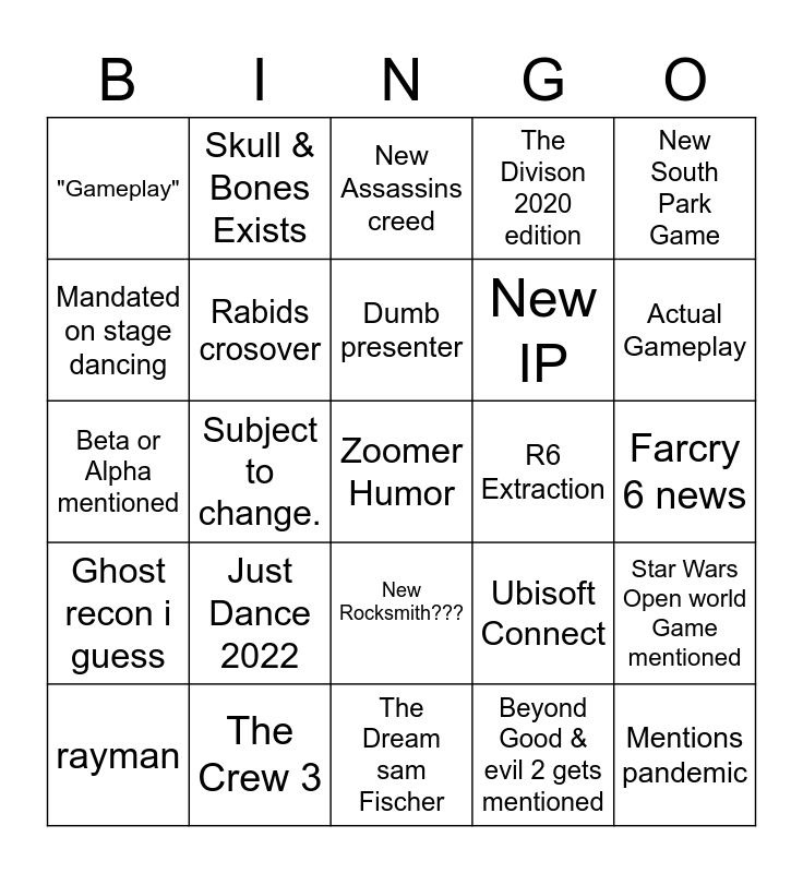 This bingo card has a free space and 24 words: Just Dance 2022, The Crew 3, Dumb presenter, rayman, New South Park Game, "Gameplay", Mandated on stage dancing, Skull & Bones Exists, R6 Extraction, New Rocksmith???, New IP, Beta or Alpha mentioned, Ubisoft Connect, Star Wars Open world Game mentioned, Rabids crosover, Beyond Good & evil 2 gets mentioned, Farcry 6 news, New Assassins creed, Actual Gameplay, Subject to change., Mentions pandemic, Ghost recon i guess, The Divison 2020 edition and The Dream sam Fischer.