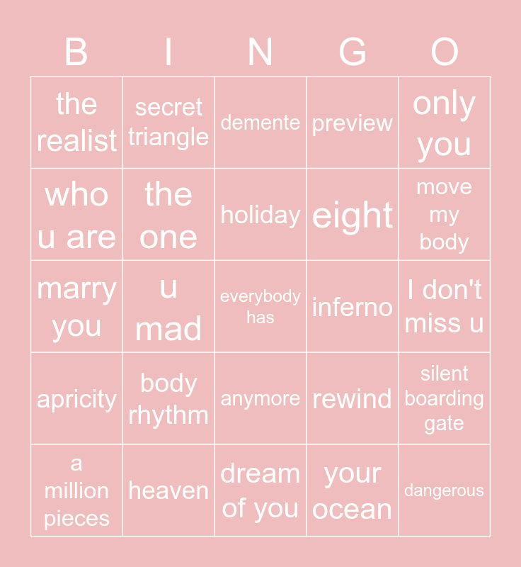 This bingo card has 25 words: apricity, heaven, everybody has, your ocean, only you, the realist, secret triangle, demente, inferno, silent boarding gate, who u are, the one, dream of you, rewind, move my body, a million pieces, u mad, holiday, eight, I don't miss u, marry you, body rhythm, anymore, preview and dangerous.