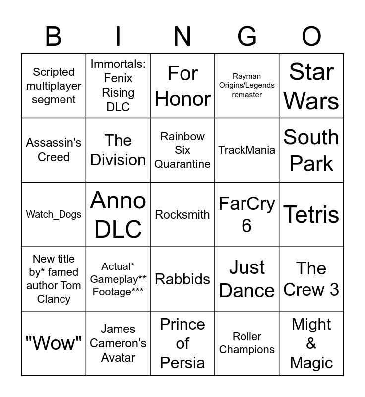 This bingo card has 25 words: Actual* Gameplay** Footage***, Prince of Persia, Rainbow Six Quarantine, "Wow", Star Wars, Scripted multiplayer segment, Assassin's Creed, Immortals: Fenix Rising DLC, FarCry 6, Rabbids, TrackMania, Watch_Dogs, Just Dance, The Crew 3, The Division, Might & Magic, Tetris, For Honor, South Park, Anno DLC, Rocksmith, James Cameron's Avatar, New title by* famed author Tom Clancy, Rayman Origins/Legends remaster and Roller Champions.