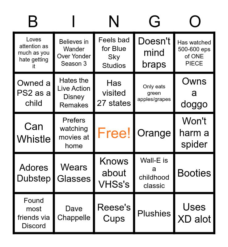 This bingo card has a free space and 24 words: Found most friends via Discord, Wears Glasses, Has visited 27 states, Plushies, Has watched 500-600 eps of ONE PIECE, Loves attention as much as you hate getting it, Believes in Wander Over Yonder Season 3, Feels bad for Blue Sky Studios, Orange, Won't harm a spider, Can Whistle, Hates the Live Action Disney Remakes, Wall-E is a childhood classic, Booties, Owned a PS2 as a child, Dave Chappelle, Reese's Cups, Doesn't mind braps, Owns a doggo, Adores Dubstep, Prefers watching movies at home, Knows about VHSs's, Only eats green apples/grapes and Uses XD alot.