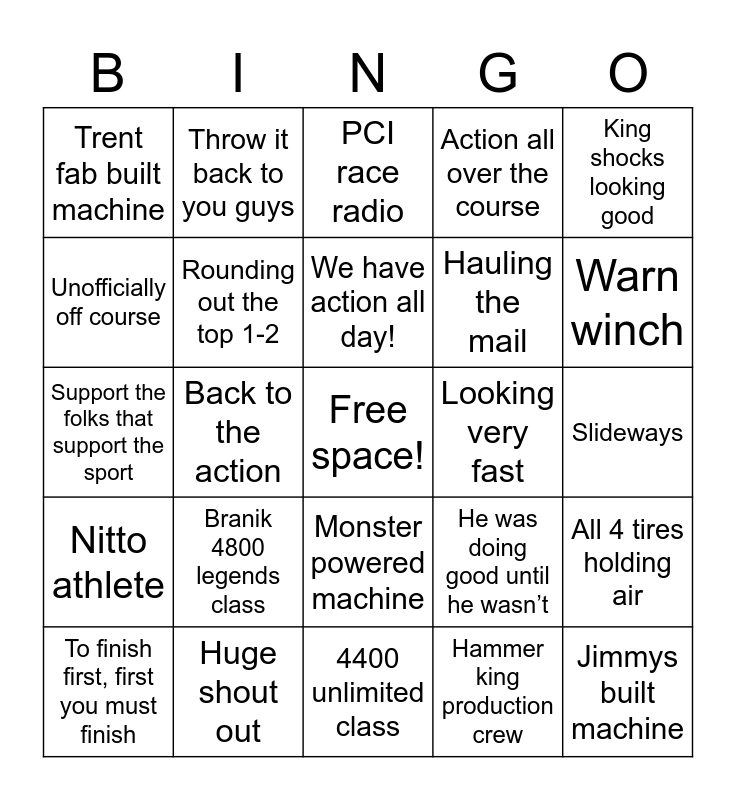 This bingo card has a free space and 24 words: To finish first, first you must finish, Branik 4800 legends class, We have action all day!, Hammer king production crew, King shocks looking good, Trent fab built machine, Throw it back to you guys, PCI race radio, Looking very fast, Slideways, Support the folks that support the sport, Rounding out the top 1-2, He was doing good until he wasn’t, All 4 tires holding air, Unofficially off course, Huge shout out, 4400 unlimited class, Action all over the course, Warn winch, Nitto athlete, Back to the action, Monster powered machine, Hauling the mail and Jimmys built machine.
