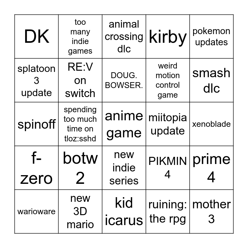 This bingo card has a free space and 24 words: botw 2, new 3D mario, DOUG. BOWSER., warioware, pokemon updates, DK, splatoon 3 update, too many indie games, miitopia update, new indie series, weird motion control game, spinoff, PIKMIN 4, prime 4, RE:V on switch, ruining: the rpg, xenoblade, animal crossing dlc, smash dlc, spending too much time on tloz:sshd, mother 3, f-zero, kirby and kid icarus.