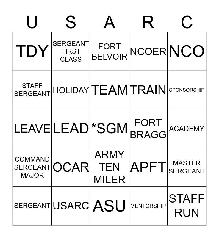 This bingo card has a free space and 24 words: OCAR, USARC, TEAM, SERGEANT, NCO, TDY, STAFF SERGEANT, SERGEANT FIRST CLASS, FORT BRAGG, ARMY TEN MILER, TRAIN, LEAVE, APFT, MASTER SERGEANT, HOLIDAY, MENTORSHIP, ACADEMY, FORT BELVOIR, SPONSORSHIP, LEAD, STAFF RUN, COMMAND SERGEANT MAJOR, NCOER and ASU.