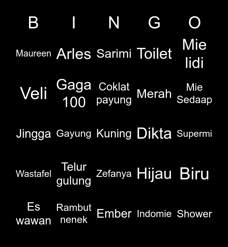 This bingo card has a free space and 24 words: Telur gulung, Rambut nenek, Coklat payung, Es wawan, Mie lidi, Maureen, Veli, Arles, Dikta, Zefanya, Merah, Jingga, Hijau, Biru, Gaga 100, Indomie, Supermi, Sarimi, Mie Sedaap, Gayung, Shower, Wastafel, Toilet and Ember.