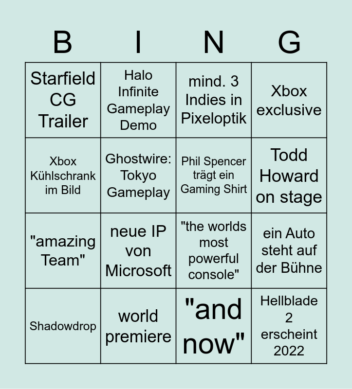 This bingo card has 16 words: world premiere, ein Auto steht auf der Bühne, mind. 3 Indies in Pixeloptik, Starfield CG Trailer, "amazing Team", Halo Infinite Gameplay Demo, "the worlds most powerful console", "and now", Xbox Kühlschrank im Bild, Ghostwire: Tokyo Gameplay, Shadowdrop, Xbox exclusive, neue IP von Microsoft, Todd Howard on stage, Phil Spencer trägt ein Gaming Shirt and Hellblade 2 erscheint 2022.