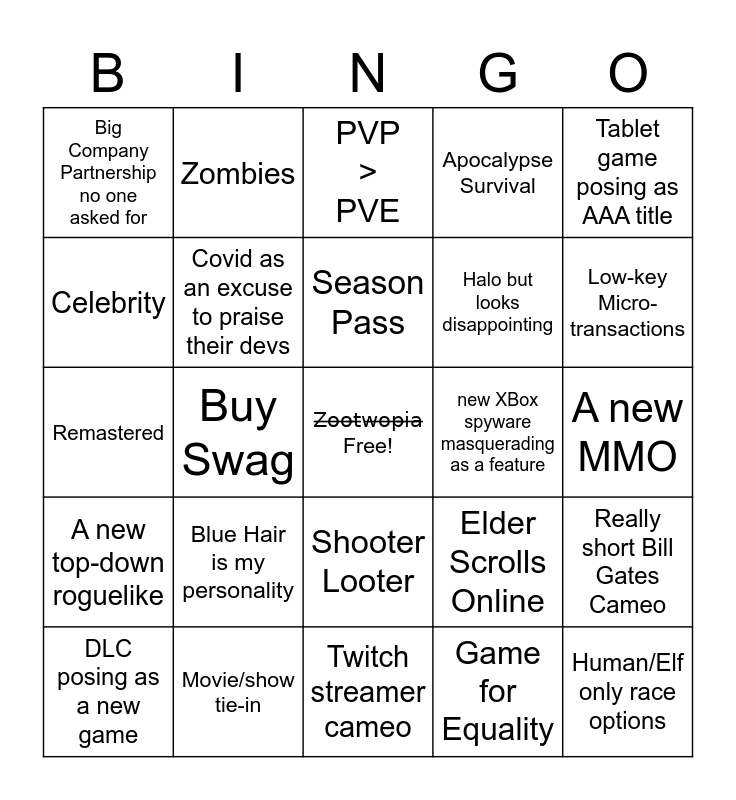 This bingo card has a free space and 24 words: Blue Hair is my personality, Movie/show tie-in, Season Pass, DLC posing as a new game, Tablet game posing as AAA title, Big Company Partnership no one asked for, Celebrity, Zombies, new XBox spyware masquerading as a feature, Shooter Looter, Halo but looks disappointing, Remastered, Elder Scrolls Online, Really short Bill Gates Cameo, Covid as an excuse to praise their devs, Game for Equality, A new MMO, PVP > PVE, Low-key Micro-transactions, Buy Swag, Human/Elf only race options, A new top-down roguelike, Apocalypse Survival and Twitch streamer cameo.
